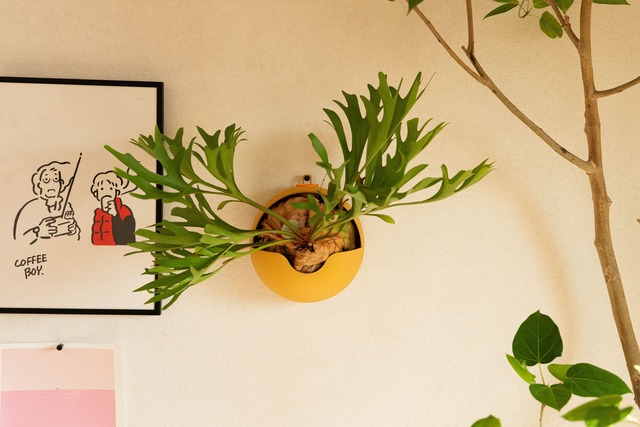 ビカクシダ育成用の壁掛けポッドです。 ビカクシダを育てることに苦手意識を持っていた作者が、ビカクシダや着生植物を手軽に楽しく育成を行えるように考えたアイデアを形にした製品です。 【BIKAKU PODの特徴】 ・受け皿が付いているので水が垂れない ビカクシダを育てていて、一番の悩みだったのが水やりの際に水苔から「水が垂れる」こと。 水場に移動したり水切りをしたりという一連の動作が面倒で、ついつい水やりの頻度が下がってしまい何度もビカクシダを枯らしてしいました。 「BIKAKU POD」は底面部が半球状の受け皿になっているので水が垂れず、場所や時間を気にせずビカクシダに水やりを行うことができます。 ・給水口&肥料バスケット付き 上部に給水口があるため、他の観葉植物と同様にジョウロなどで簡単に水やりを行えます。 また、固形肥料を入れておけるバスケットが付属するため肥料配合の手間も削減できます。 ・糸が必要ないので板付が楽 ビカクシダの手入れで面倒なのが「板付」。 専用の糸が必要で、綺麗な形に整えるにはある程度技術も必要なので苦手意識を感じている人も多いはず。「BIKAKU POD」は糸を使わず上下のカバーで水苔を挟み込むだけで植物を固定できるので植え替えが簡単です。 また、球状のデザインにしているため貯水葉がカバーに沿って丸く展開し、立体的な株姿に育てることができます。 ・ポップなカラーとミニマルなデザイン ビカクシダの着生板は無骨な印象なものが多いので、部屋のインテリアによっては相性が悪いこともありますが「BIKAKU POD」はミニマルなデザインにとどめているため比較的幅広いお部屋に合うと思われます。 ・壁掛けフック付き プッシュピンなどで簡単に壁にかけられるようにフック(穴径8×14mm)を付けています。 ビカクシダの育成が苦手だった作者が、この「BIKAKU POD」を導入してからは一株も枯らすことなくビカクシダを育てられるようになりました。 同じようなビカクに苦手意識を抱えている方、着生植物初心者の方々に届けば幸いです。 ------------------------------------------------------------------------ サイズ:M(15×15×10cm) カラー:イエロー/グレー 素材:PLA